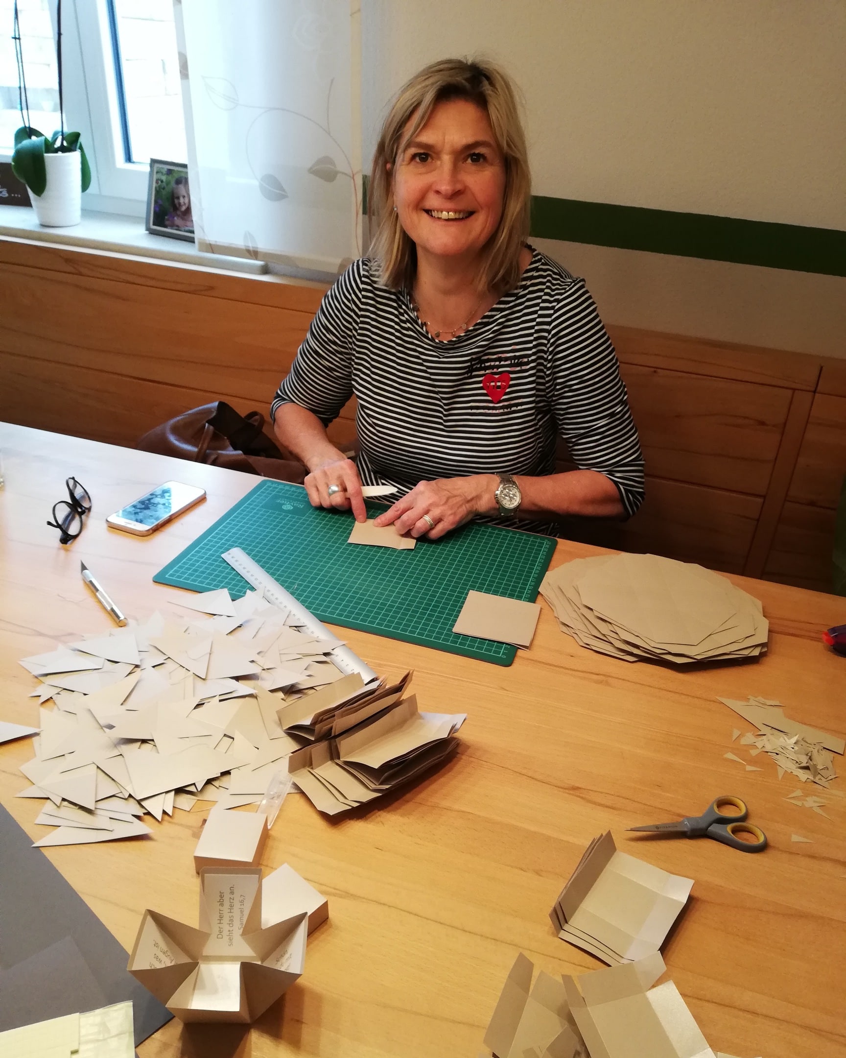 Manche Bastel- und Verpackungsaktionen gehen einfach leichter, wenn man Unterstützung am Tisch hat. 😊 Zwischen Schneidematte, Papierstapeln und kleinen Handgriffen entstehen Schritt für Schritt viele Teile, die später zu etwas Schönem werden.